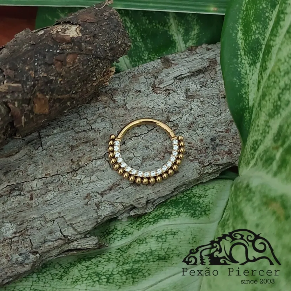 Argola Slim Clicker em TITÂNIO PVD GOLD com Pedras e Esferas FRONTAL 608